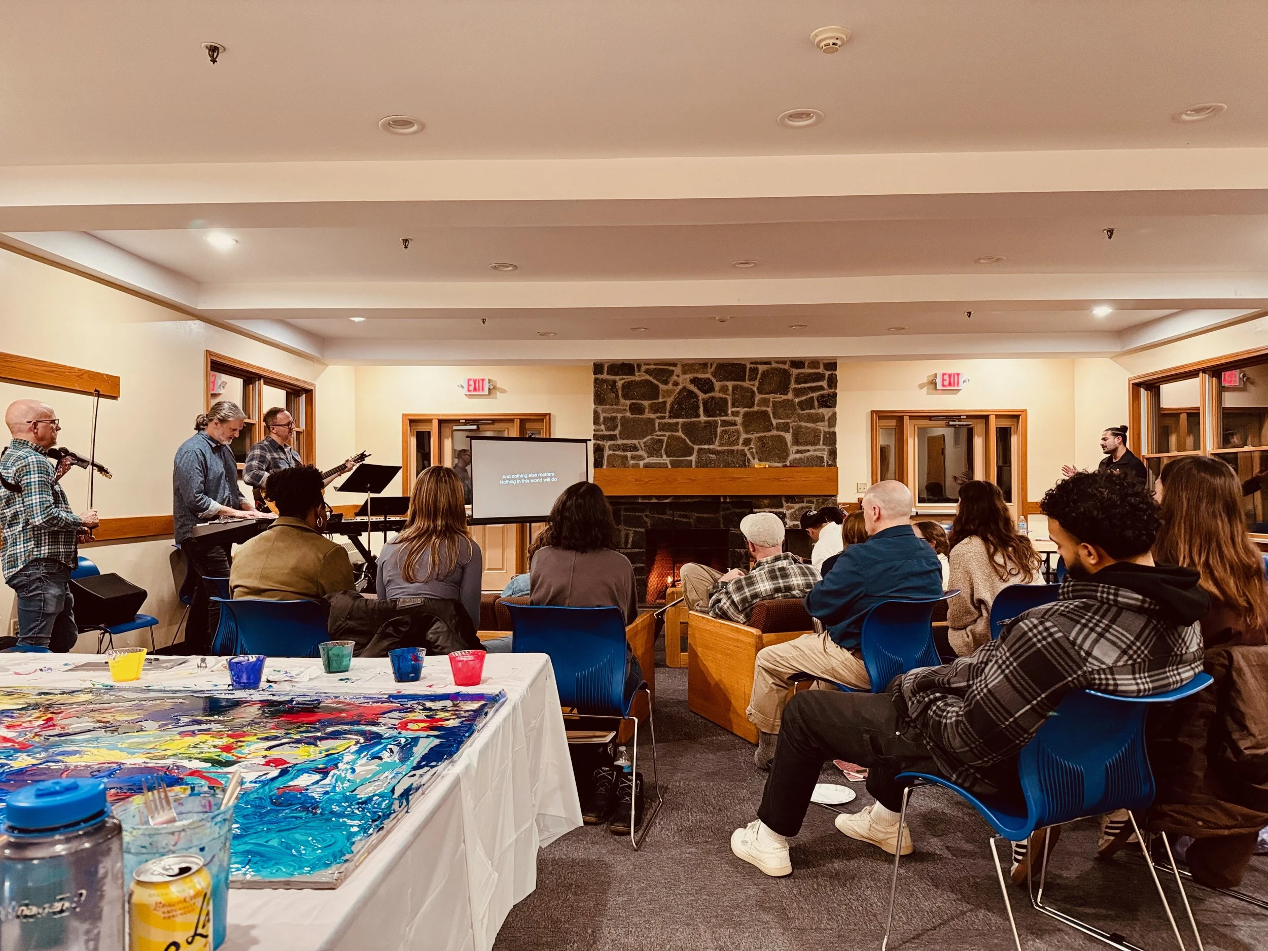 We wanted to feed people with the Gospel for them first. The first night I preached on the woman who anointed Jesus’ feet with expensive perfume in Mark 14/Matthew 26… and John 12 (with a little Luke 7). That led into a group art project where each person poured acrylic paint on a large piece of primed plywood. Their “perfume” was colorful, chaotic, and disarmed those who poured. It was a tangible way to shift from travel into a creative mindset. Before the end of the retreat, Dan Miller touched it up to pull it together. We all agreed it actually stands on its own now! The “Color Blob,” as it was affectionately coined, will likely become a welcoming table for future art outreaches. It is filled with our prayers, our grateful response to Jesus’ love for us. It will continue to be a way to disarm and invite people into his love.