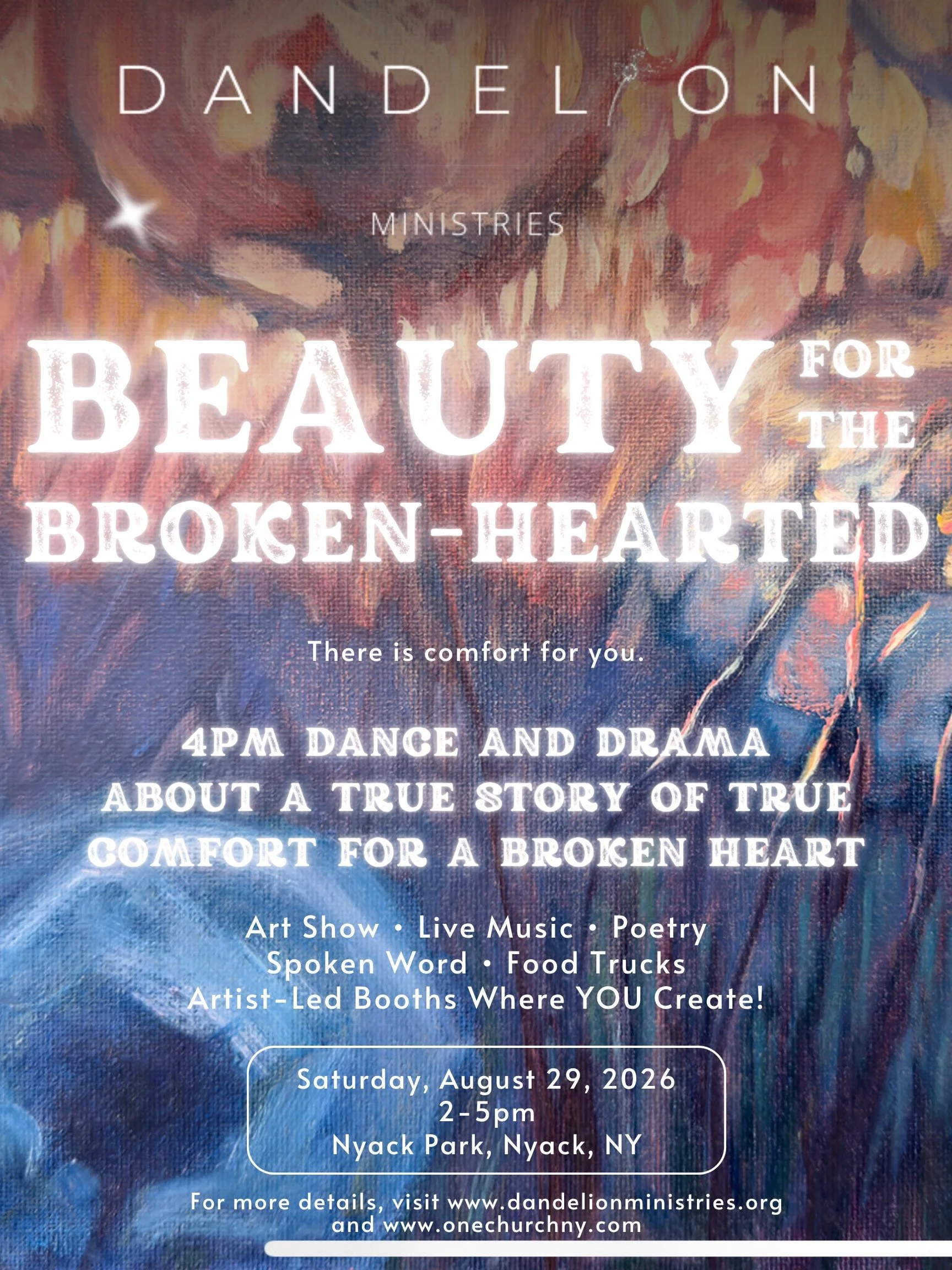 Beauty for the Brokenhearted Arts Festival Saturday, August 29, 2026 1:00 PM 5:00 PM Google Calendar ICS